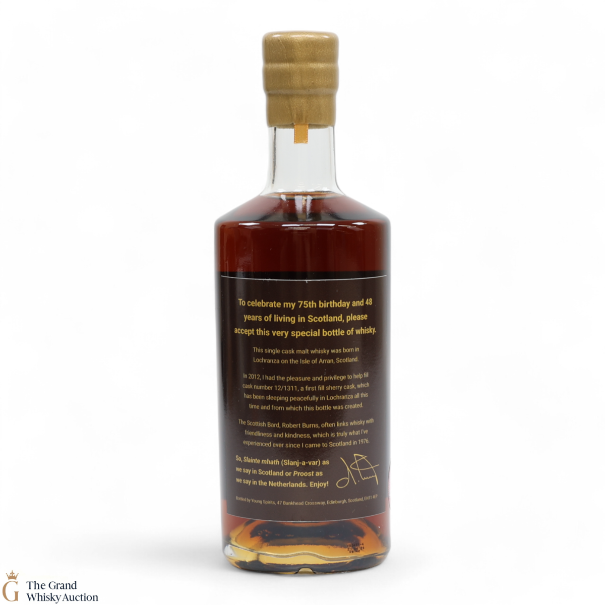 Due to the various ages of bottles and their seals, the condition of liquid is at the buyer's discretion and no claim can be lodged against failure/leakage in transit. Loss and breakage cover is available at 3% of the hammer price as standard. If the lot is not insured, no claim can be lodged against the courier or The Grand Whisky Auction for breakage or loss in transit.