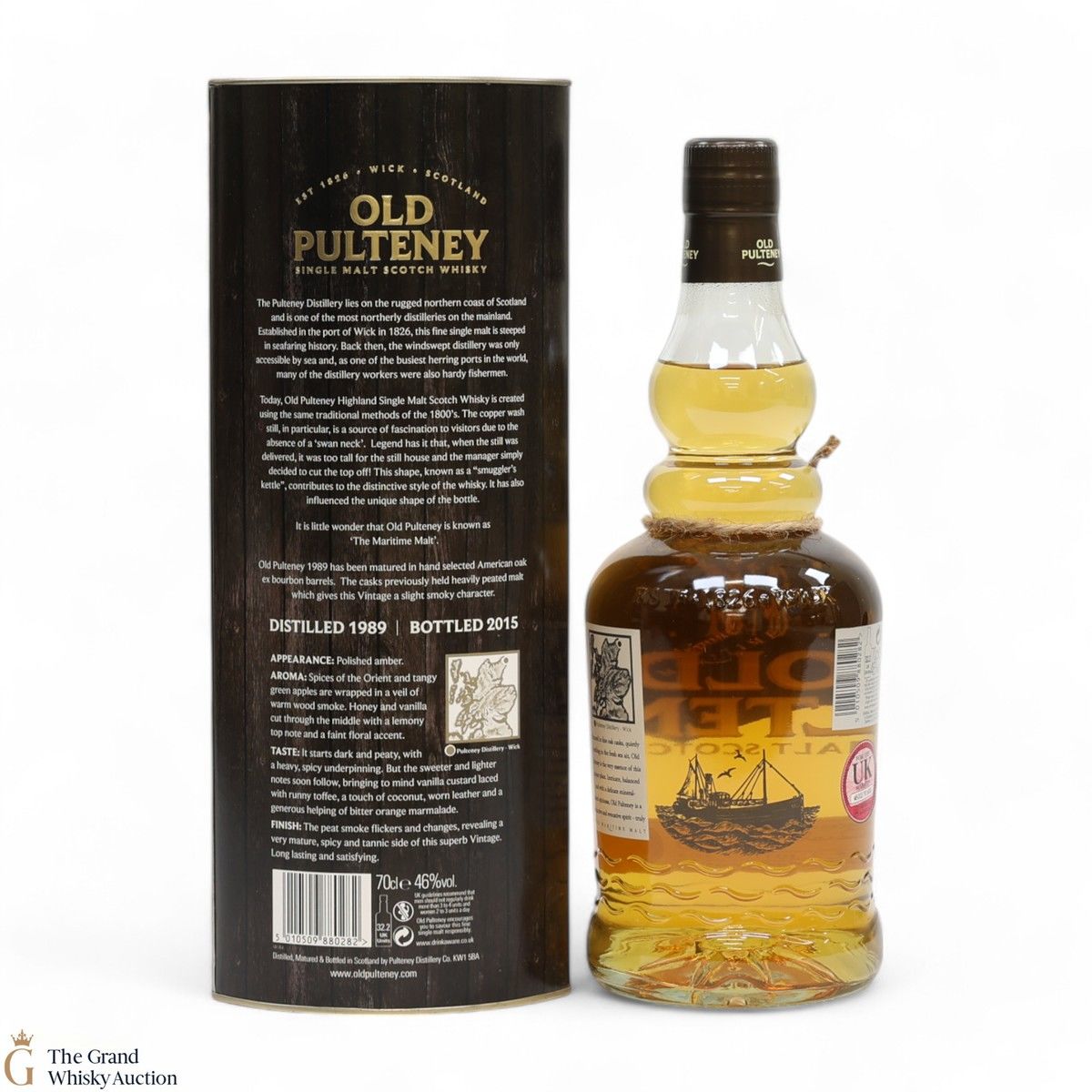 This Old Pulteney 1989 vintage was awarded World's Best Single Malt Whisky at the 2016 World Whiskies Awards. To give the 1989 vintage a peaty, smoky character, the whisky was matured in American oak ex-bourbon barrels, which previously held heavily peated malt.
