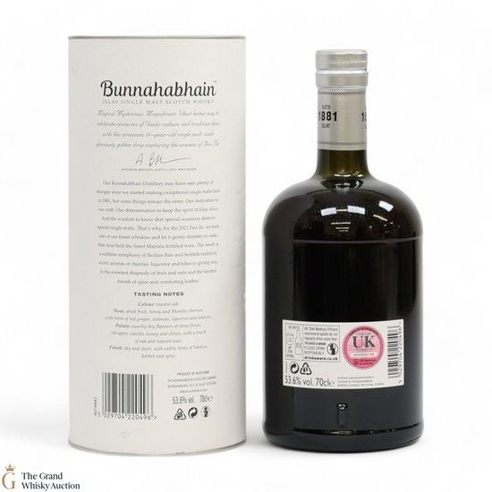 For Feis Ile 2021, Bunnahabhain Distillery released this unique bottling. Distilled back on the 8th of October 2001, this single malt was finished in a cask that once held Marsala fortified wine resulting in a combination of Sicilian flair and Scottish tradition. Bottled on the 19th of January 2021, this is one of only 1333 bottles produced.