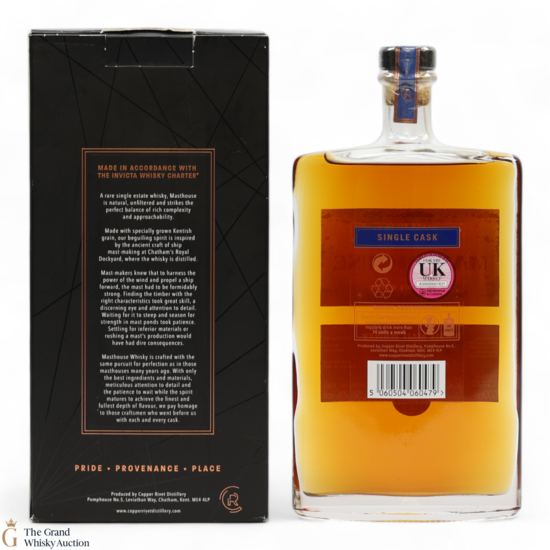 Kent and London team up to present an English single malt whisky from the Copper Rivet distillery in Chatham. The 2018 vintage expression was bottled from a single cask #137 at 56.2% ABV with natural colour and no chill-filtration.