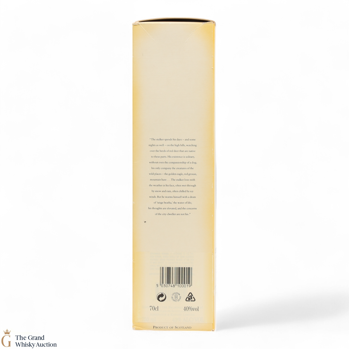 Due to the various ages of bottles and their seals, the condition of liquid is at the buyer's discretion and no claim can be lodged against failure/leakage in transit. Loss and breakage cover is available at 3% of the hammer price as standard. If the lot is not insured, no claim can be lodged against the courier or The Grand Whisky Auction for breakage or loss in transit.