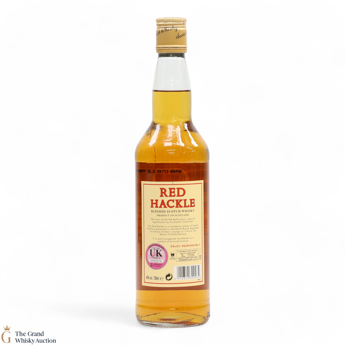 Due to the various ages of bottles and their seals, the condition of liquid is at the buyer's discretion and no claim can be lodged against failure/leakage in transit. Loss and breakage cover is available at 3% of the hammer price as standard. If the lot is not insured, no claim can be lodged against the courier or The Grand Whisky Auction for breakage or loss in transit.