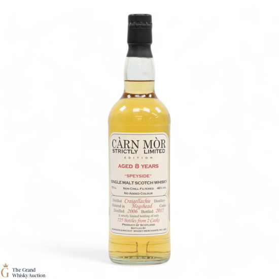 A Strictly Limited Carn Mor bottling of single malt distilled in 2006 at Craigellachie Distillery and matured in 2 hogshead casks. This 8-year-old was bottled in 2015 and is one of 725 bottles.
