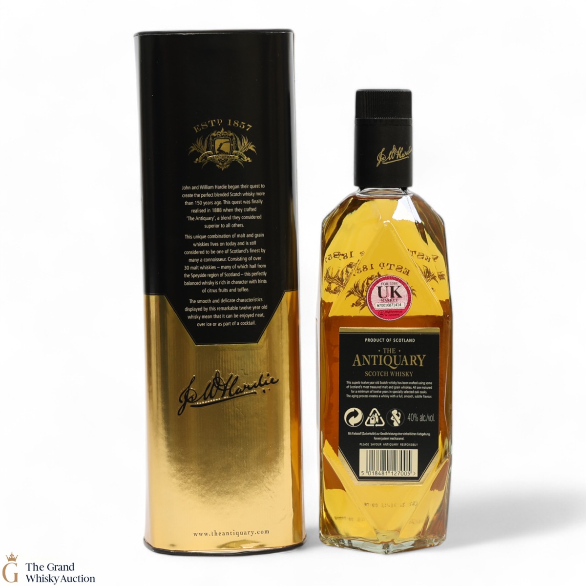 This bottling from Antiquary is a blend of some of Scotland's greatest 12-year-old malt and grain whiskies, including Royal Lochnagar, Tomatin, Cragganmore, Mortlach, Bowmore, Glenkinchie to name a few. Also, a quirky feature is that In the lid of this bottle box, there is a coaster that pops out!