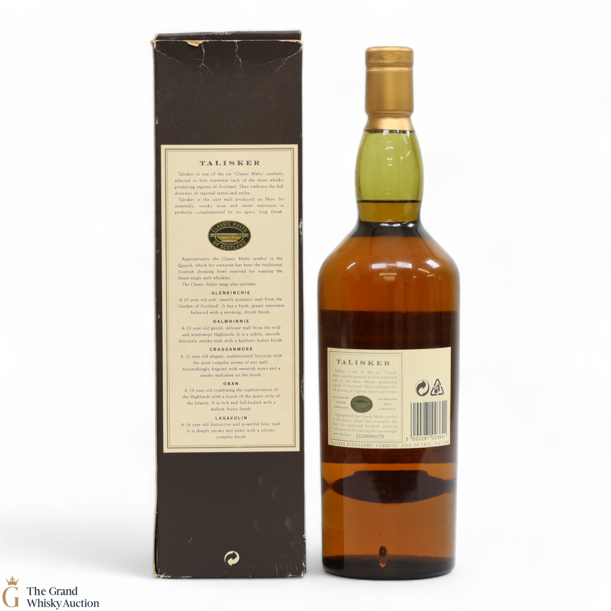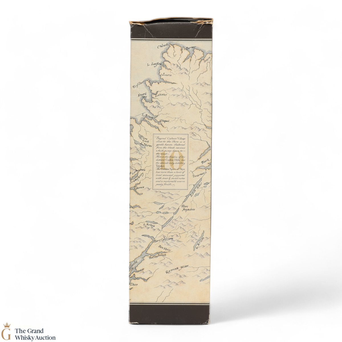 An older release of 10 Year Old from Talisker distillery on the Isle of Skye. Aged for a minimum of 10 years in American oak casks. The bottle label and the box feature a map of Skye. This is a 1L bottle.