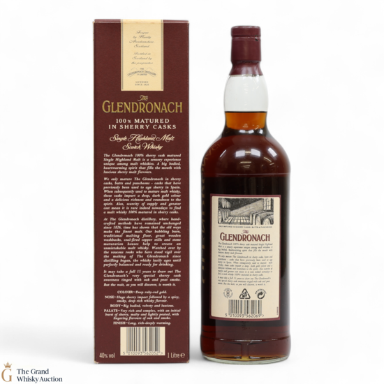 A 1L bottle of Glendronach 15 Year Old from the 1990s. Matured exclusively sherry casks. At the time of release, this expression was a flagship whisky for Glendronach. It has since been followed by the new and very popular 15-Year-Old Revival.