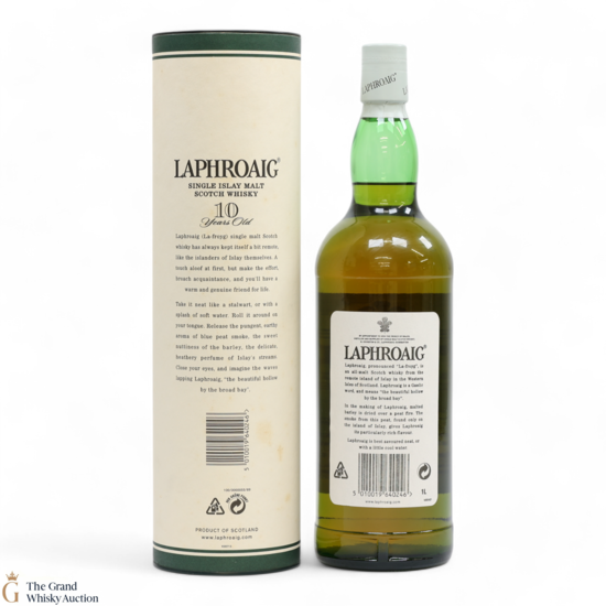 A 1L of the medicinal 10-year-old from Islay's bestselling distillery, Laphroaig. In making Laphroaig, malted barley is dried over a peat fire. The smoke from this peat, found only on Islay, gives Laphroaig its particularly rich flavour.
