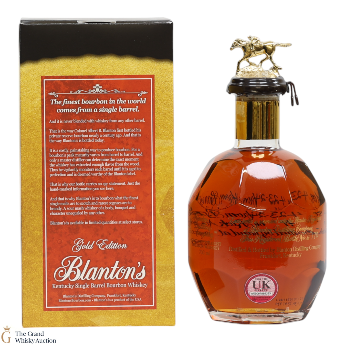 PLEASE NOTE: The wax seal on Blanton's bottles are prone to cracking in transit due to their design. Therefore, as stated in our T&C’s, we do not and will not accept liability should the seal be breached, broken, split or leak in transit. Additionally, please know due to the design of the internal cardboard packaging that surrounds the top of the bottles, it too may be torn. By bidding on this lot you have understood this to be true. Insurance is for complete breakage or loss in transit only.
