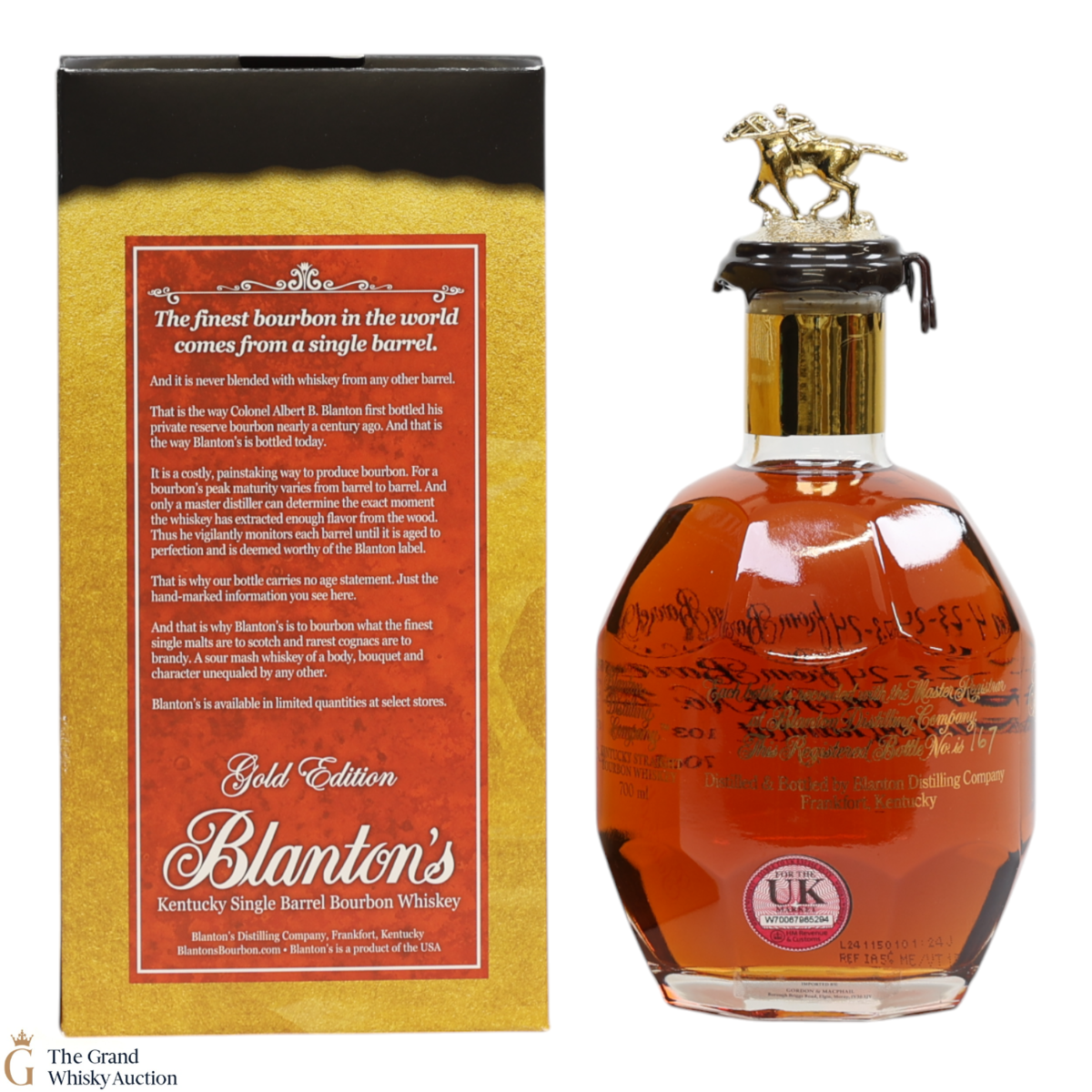 PLEASE NOTE: The wax seal on Blanton's bottles are prone to cracking in transit due to their design. Therefore, as stated in our T&C’s, we do not and will not accept liability should the seal be breached, broken, split or leak in transit. Additionally, please know due to the design of the internal cardboard packaging that surrounds the top of the bottles, it too may be torn. By bidding on this lot you have understood this to be true. Insurance is for complete breakage or loss in transit only.