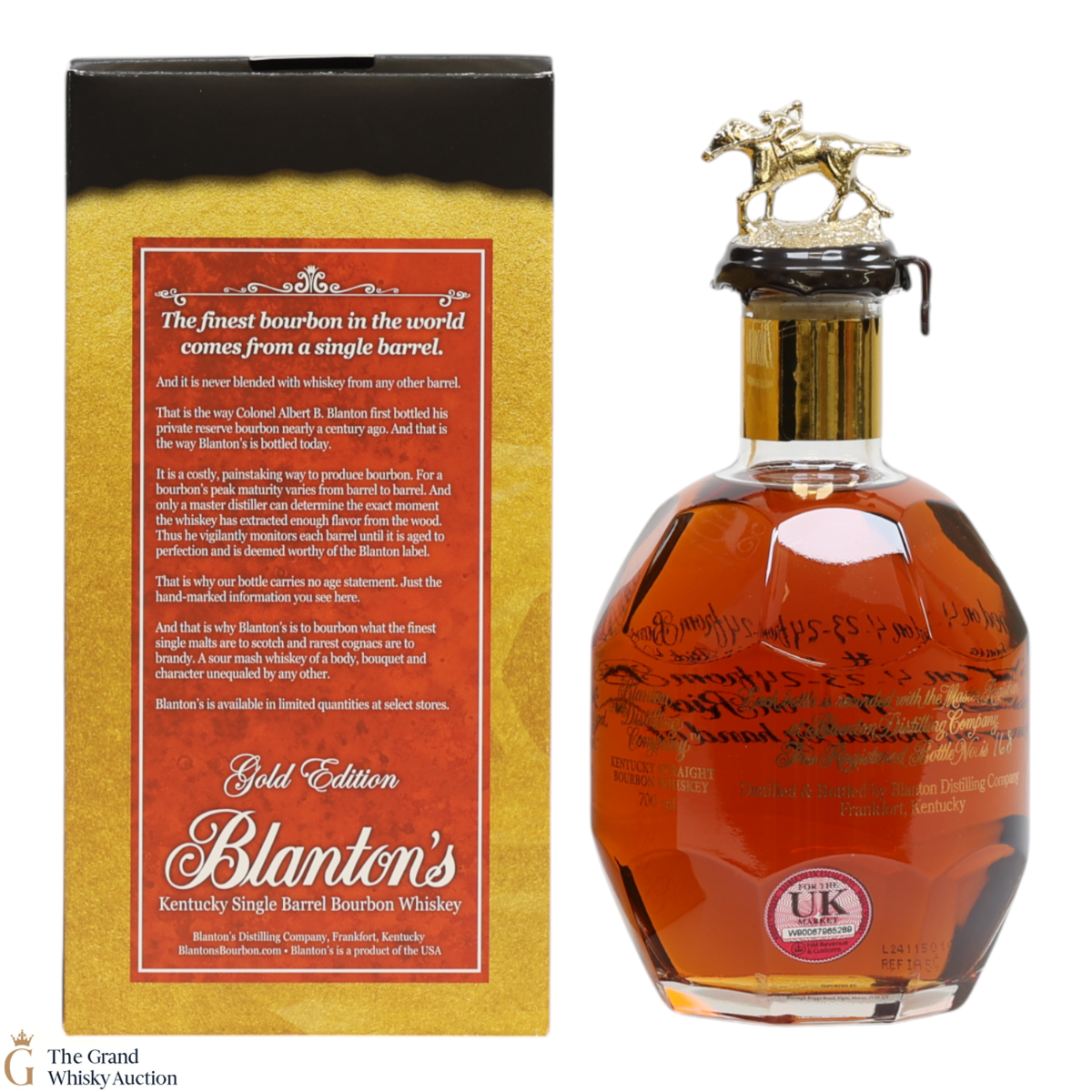 PLEASE NOTE: The wax seal on Blanton's bottles are prone to cracking in transit due to their design. Therefore, as stated in our T&C’s, we do not and will not accept liability should the seal be breached, broken, split or leak in transit. Additionally, please know due to the design of the internal cardboard packaging that surrounds the top of the bottles, it too may be torn. By bidding on this lot you have understood this to be true. Insurance is for complete breakage or loss in transit only.