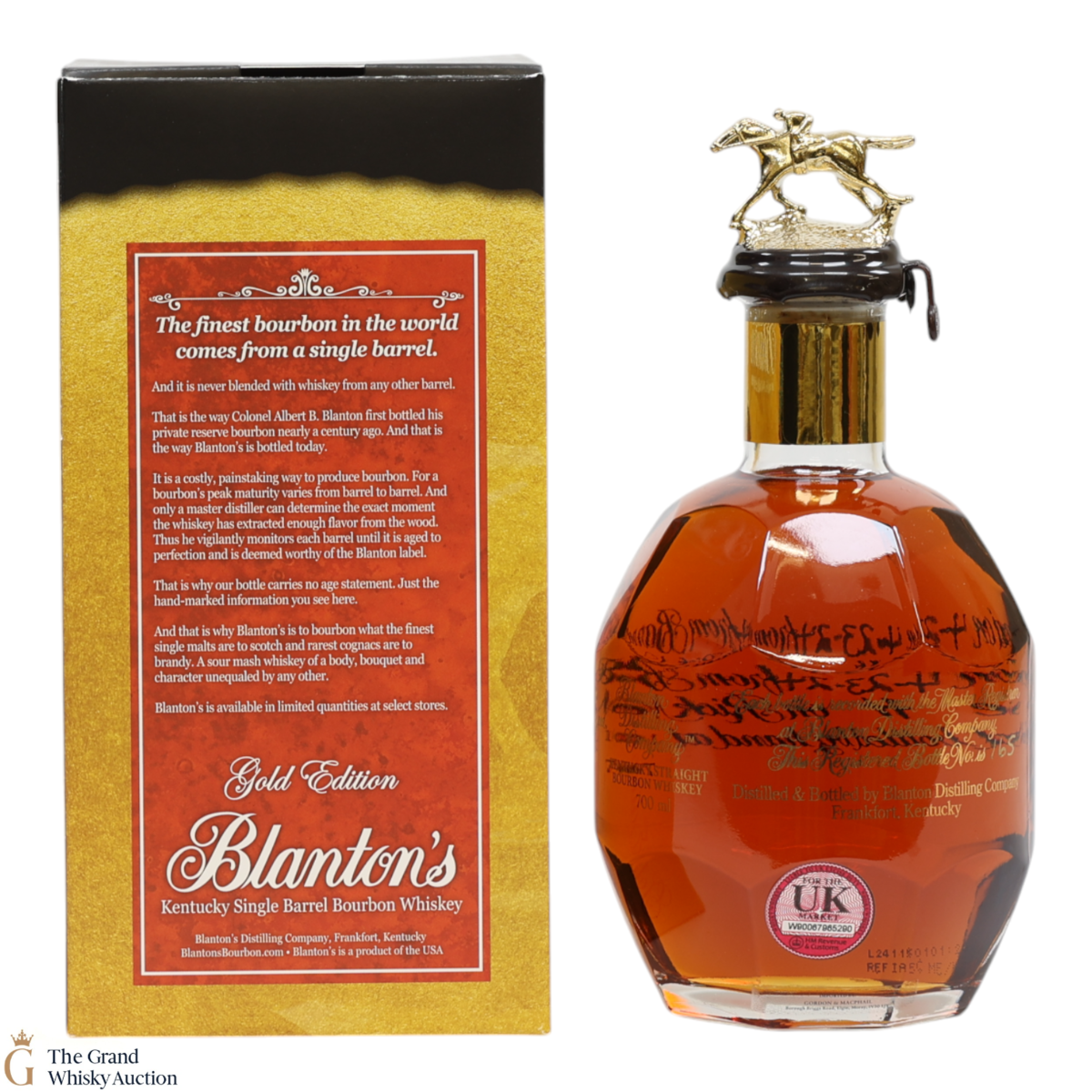 PLEASE NOTE: The wax seal on Blanton's bottles are prone to cracking in transit due to their design. Therefore, as stated in our T&C’s, we do not and will not accept liability should the seal be breached, broken, split or leak in transit. Additionally, please know due to the design of the internal cardboard packaging that surrounds the top of the bottles, it too may be torn. By bidding on this lot you have understood this to be true. Insurance is for complete breakage or loss in transit only.