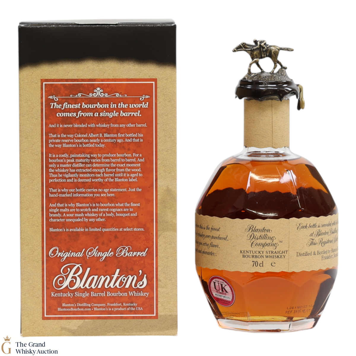 PLEASE NOTE: The wax seal on Blanton's bottles are prone to cracking in transit due to their design. Therefore, as stated in our T&C’s, we do not and will not accept liability should the seal be breached, broken, split or leak in transit. Additionally, please know due to the design of the internal cardboard packaging that surrounds the top of the bottles, it too may be torn. By bidding on this lot you have understood this to be true. Insurance is for complete breakage or loss in transit only.