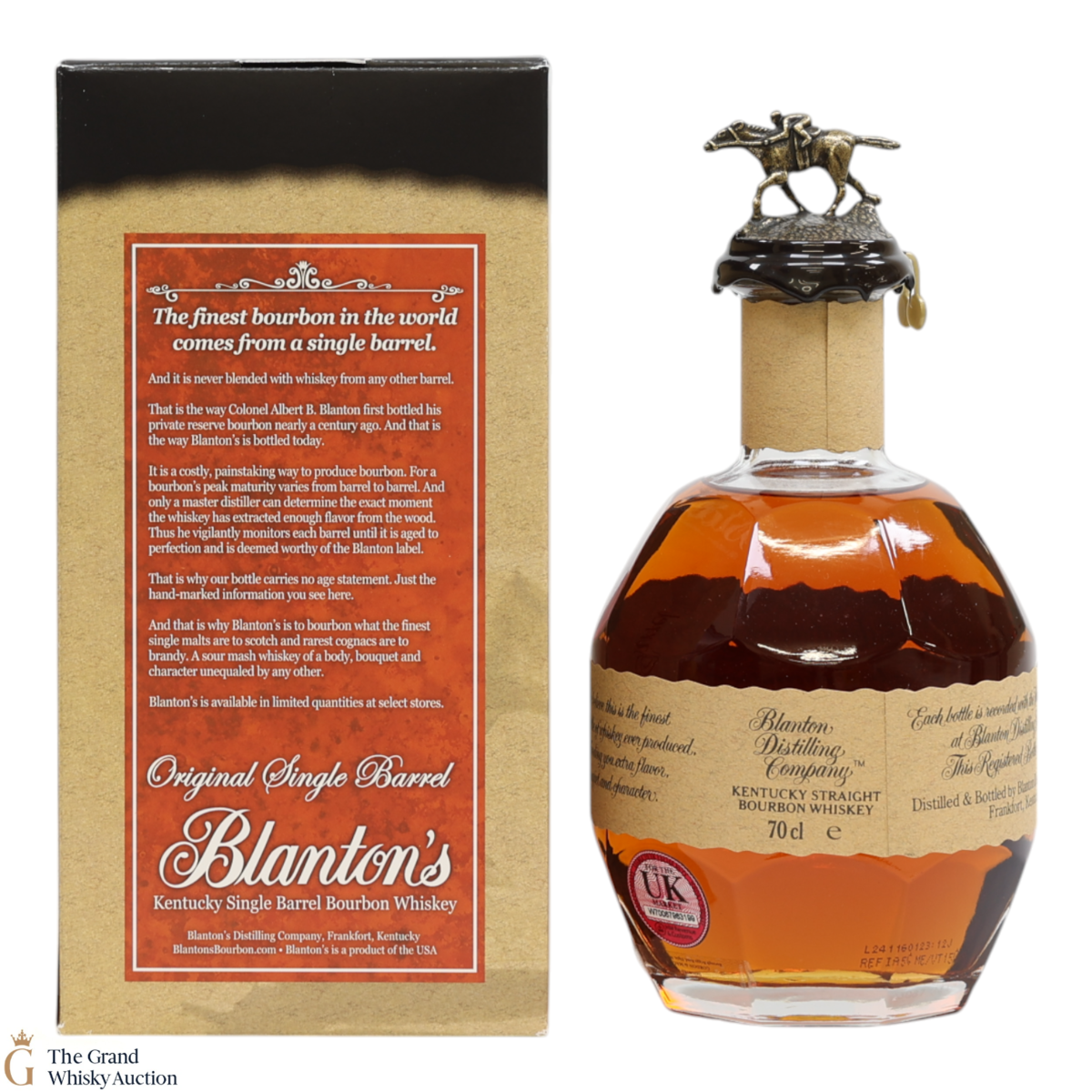 PLEASE NOTE: The wax seal on Blanton's bottles are prone to cracking in transit due to their design. Therefore, as stated in our T&C’s, we do not and will not accept liability should the seal be breached, broken, split or leak in transit. Additionally, please know due to the design of the internal cardboard packaging that surrounds the top of the bottles, it too may be torn. By bidding on this lot you have understood this to be true. Insurance is for complete breakage or loss in transit only.