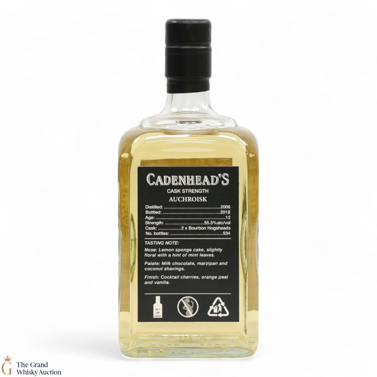 Distilled at the Speyside Distillery Auchroisk in 2006, this single malt was matured in two bourbon hogshead casks for 12 years. It was bottled in 2018 by Scotland's oldest independent bottler, Cadenhead's at 55.3% as a small batch release.
