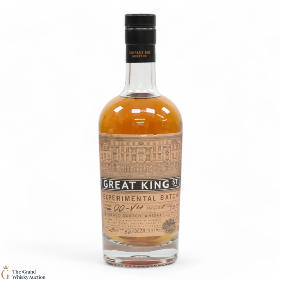 Experimental Batch is a blended scotch whisky from the Great King Street lineup, identified by its experimental number 00-V4. It is bottled by Compass Box Whisky Co. with a volume of 50cl and an ABV of 43%.