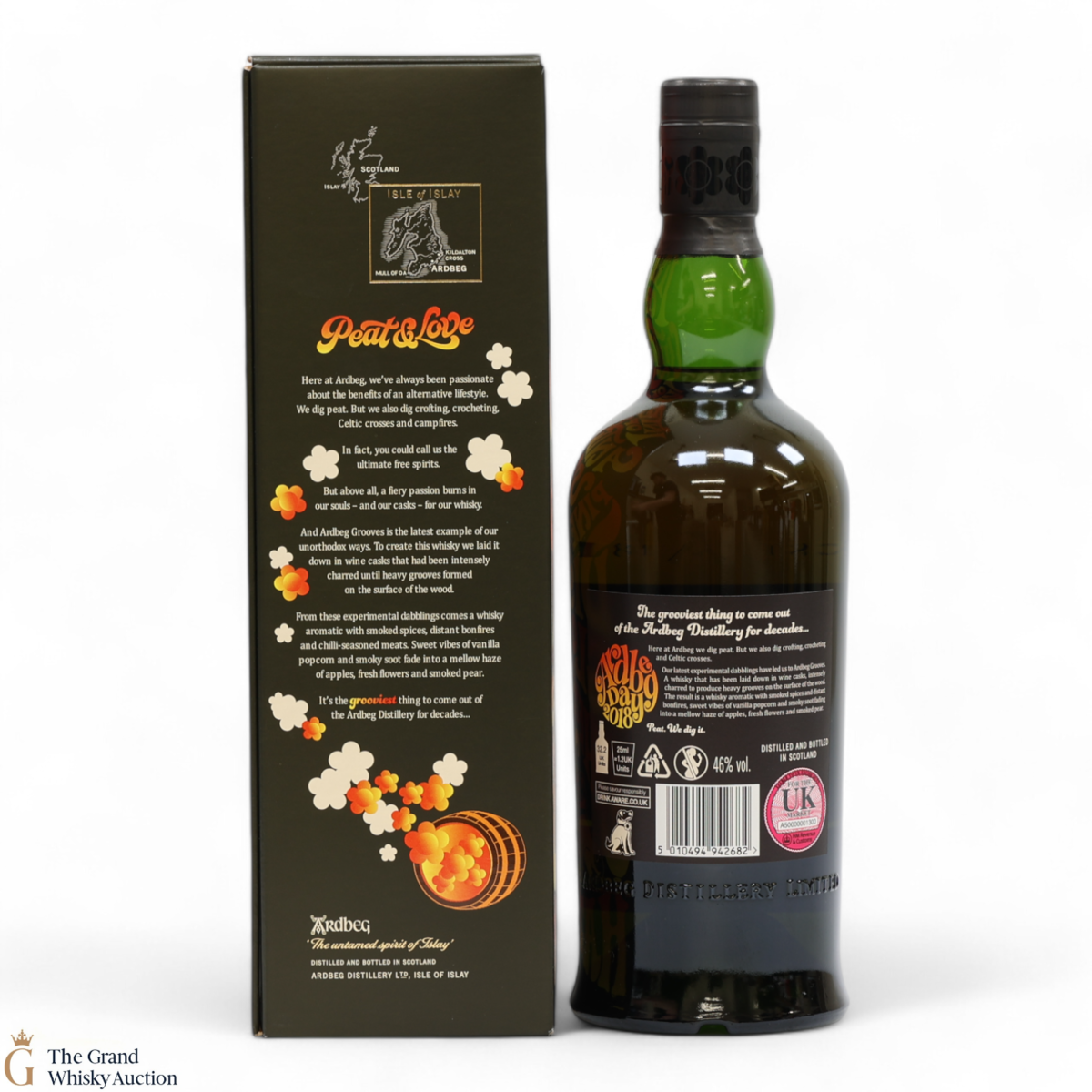 This limited edition Islay single malt was released to mark the 2018 Ardbeg Day at the Islay Festival of Music & Malt. The theme is a throwback to the Island's 1960s spirit, embodying the ideals of 'peat & love'! Ardbeg Grooves is crafted with ex-wine casks that are re-charred to create heavy grooves in the wood, allowing more interaction with the spirit and creating a richer flavour.
