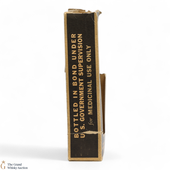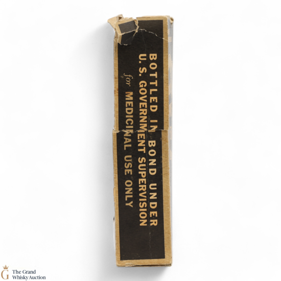 The label on the back of the bottle reads "Rx Spiritus Frumenti," the official medicinal name for whiskey, and "For medicinal purposes only. Sale or use for other purposes will cause heavy penalties to be inflicted."