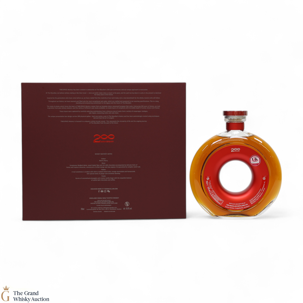 This whisky is contained in a unique circular vessel symbolising the circle of life and the ongoing journey from the past to the future. It was matured in one of Macallan's bespoke sherry-seasoned European oak casks until bottled at a strength of 43.6% ABV.