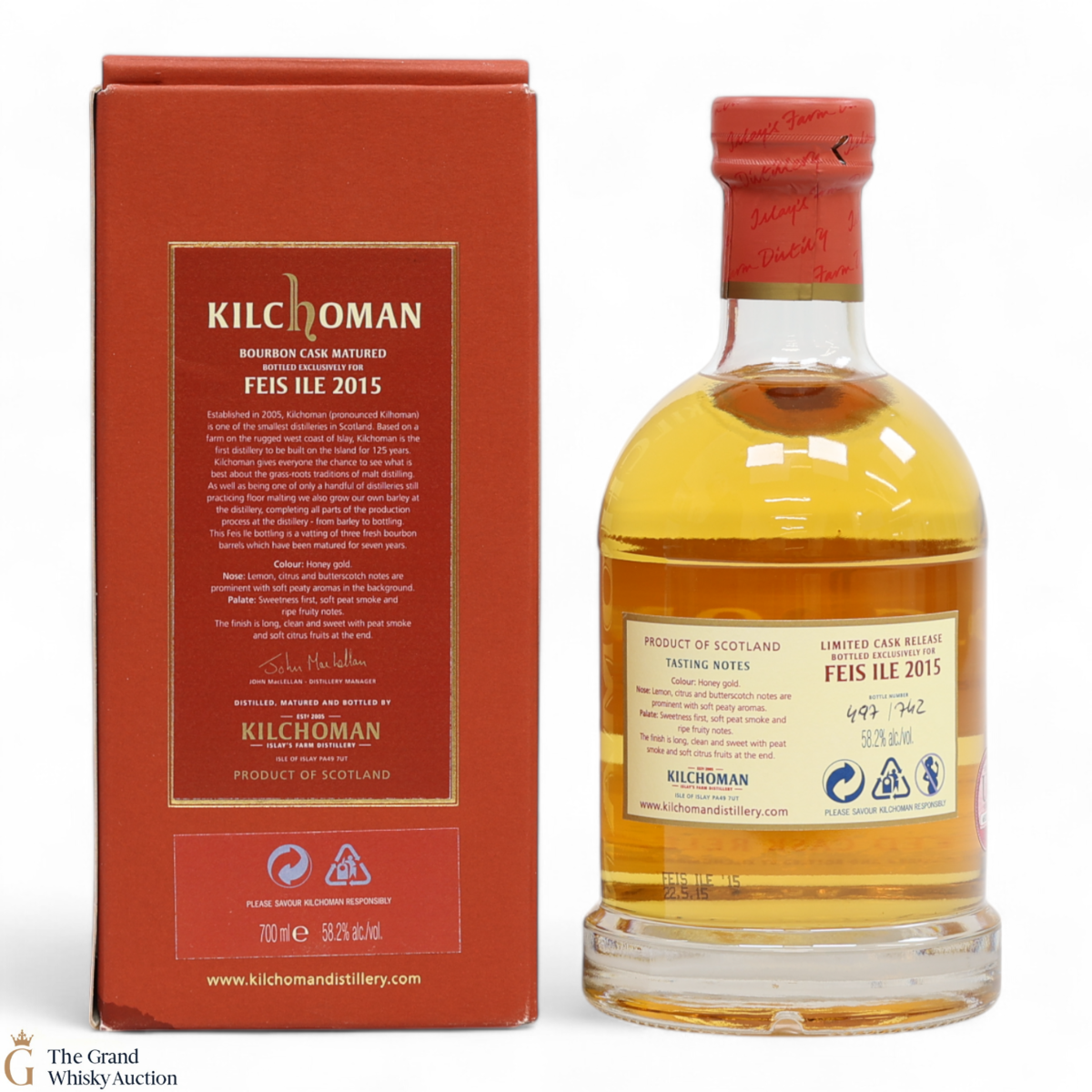 This was the Kilchoman Fèis Ìle 2015, which was sold exclusively at Kilchoman Distillery. Matured in bourbon casks numbers 245, 249 & 250 distilled May 2008, it was bottled in May 2015 at 58.2% ABV. This is one of only 742 bottles produced.