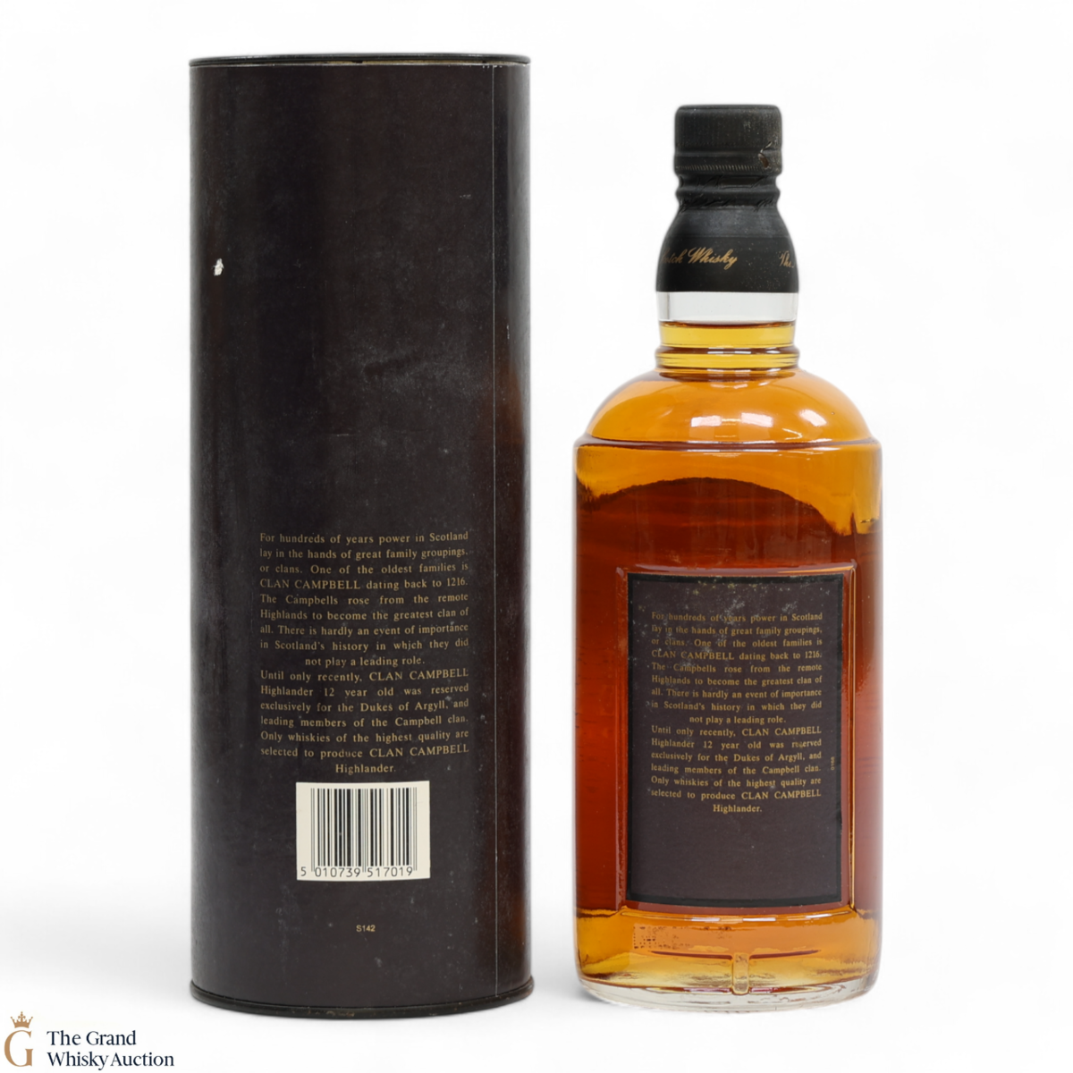 12 year old blended Scotch whisky from the Clan Campbell range, produced by Muir Mackenzie & Co. back in the 1980s. Clan Campbell has long been a popular blend on mainland Europe - particularly in France. The tin was produced by Barringer, Wallis & Manners.