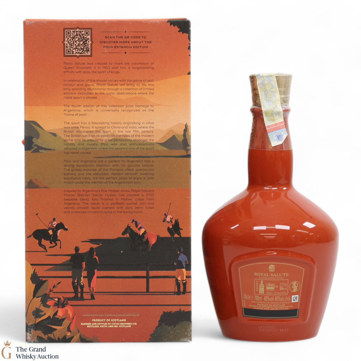 Royal Salute 21 year The Polo Estancia Edition is a tribute to Argentina, the spiritual home of Polo. The whisky was finished in ex-Argentine Malbec casks and bottled in a reddish flagon.