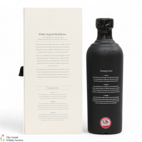 Distilled at Arran Distillery, this is the 6th release of their White Stag. Chosen by Distillery Manager David Livingstone, this single malt was originally distilled in 1997. David Livingstone picked out a Sherry Hogshead and a Sherry Puncheon which were married together, the resulting whisky being 23 years old.