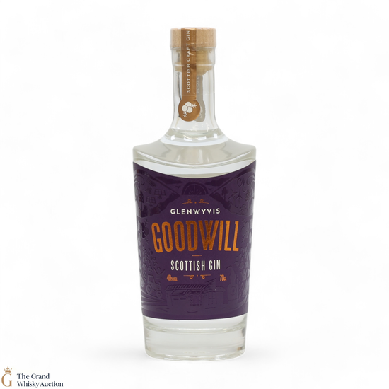 GlenWyvis Goodwill Scottish Gin was produced in the Highlands of Scotland. It features a blend of classic gin botanicals like juniper with unique elements that may include locally foraged herbs or fruits.