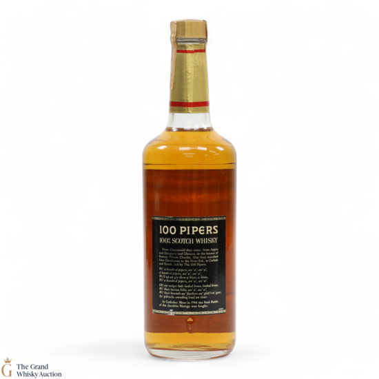 A 75cl bottling of Seagram's 100 Pipers Deluxe blended Scotch whisky, which was named after the 100 pipers that followed Bonnie Prince Charlie into battle.