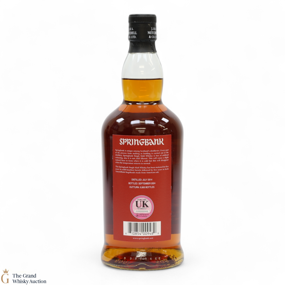 This Springbank Single Malt Whisky was distilled in July 2014 and has been matured for five years in refill bourbon barrels followed by four years in fresh amontillado hogsheads made from American oak. It was then bottled in September 2024 at a strength of 55% ABV with an outturn of 9,900 bottles.