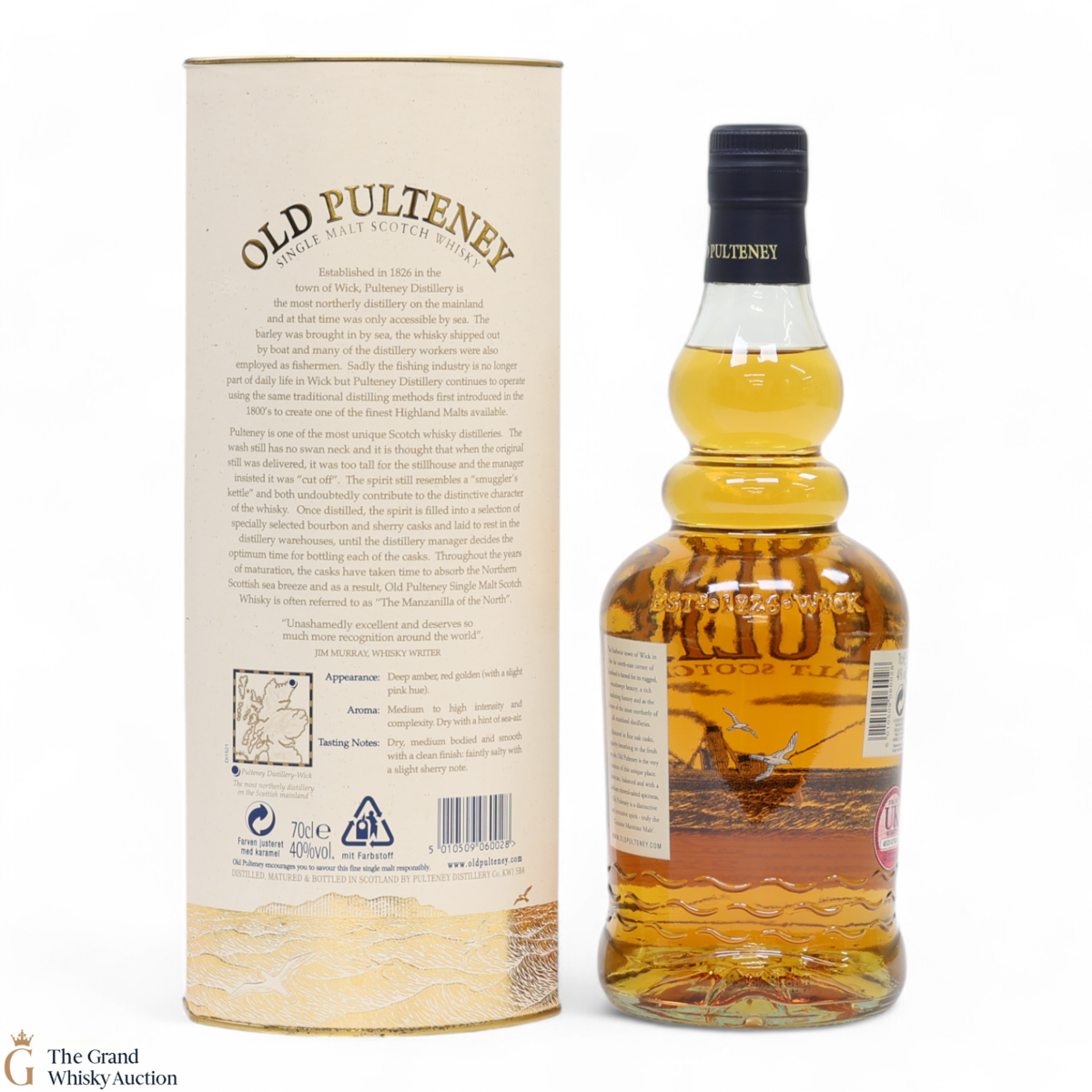 Old Pulteney is known as the Maritime Malt due to the distillery's location in the very North of Scotland and this is honoured with the unique shape of the bottle.
