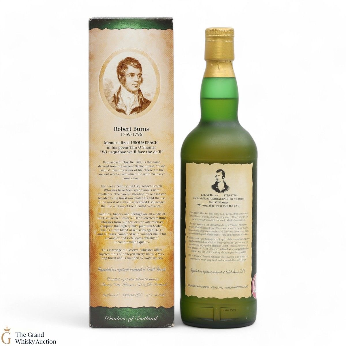 “Usquaebach” is immortalized by the famous Scottish poet, Robert Burns, in his poem Tom O'Shanter: “Wi Usquaebach we'll face the de'il” – or, “With Usquaebach we'll face the devil.” The word is commonly used to refer to Scotch whisky throughout the UK.