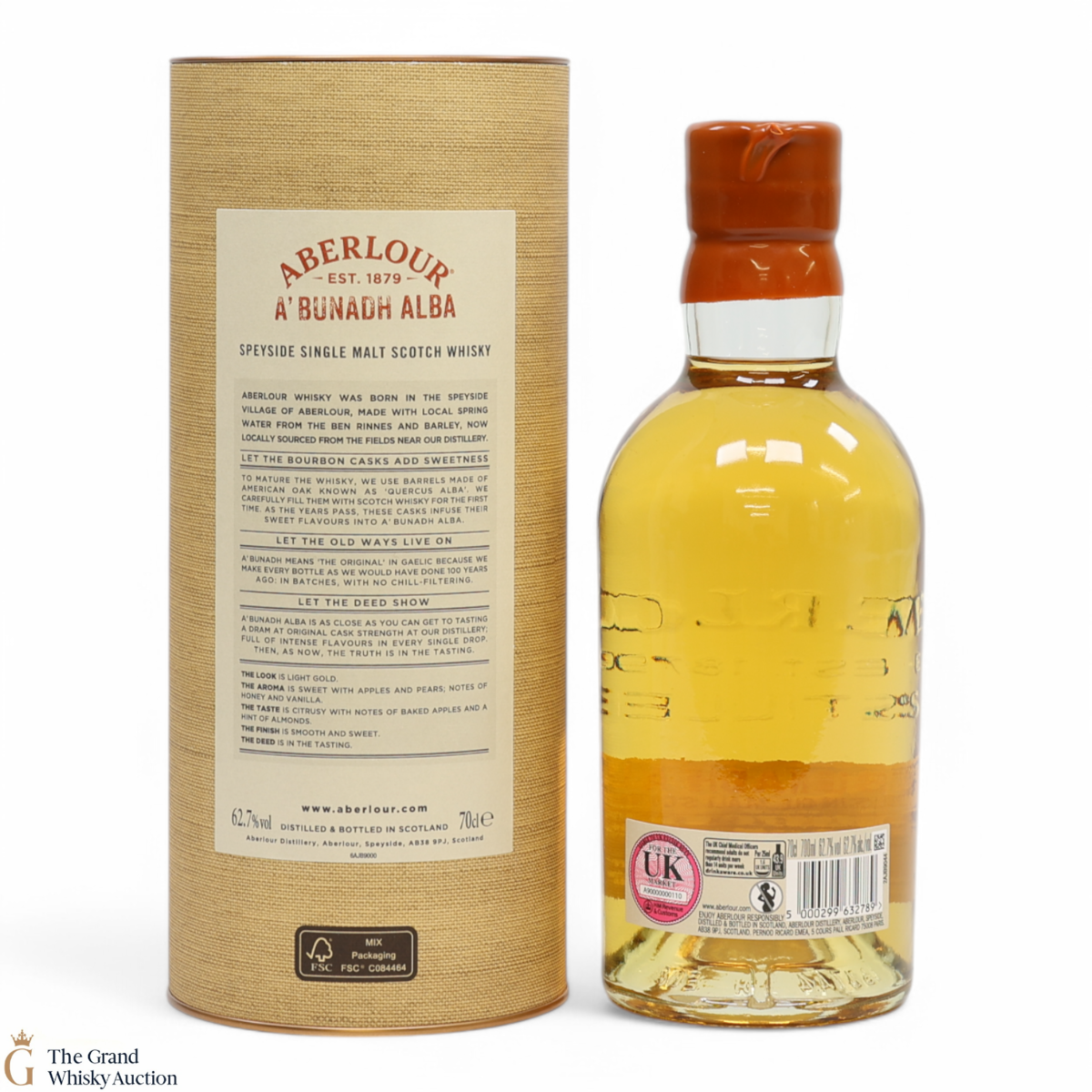 Distilled at the Aberlour Distillery, this single malt was matured in bourbon oak barrels until being bottled at the cask strength of 62.7% ABV. This is batch 5 of the A'Bunadh Alba.