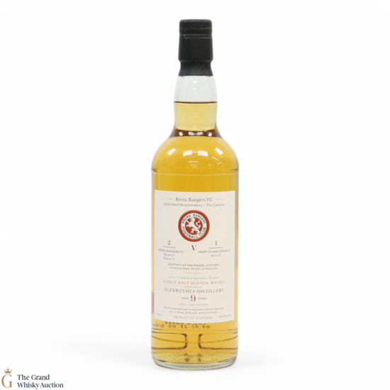 Distilled at Glenrothes Distillery, this single malt was matured for 9 years before being bottled by the Eagle Hotel in Dornoch, Sutherland. This bottle was produced to commemorate the 2-1 victory Brora Rangers gained over Hearts on the 23rd of March 2021.
