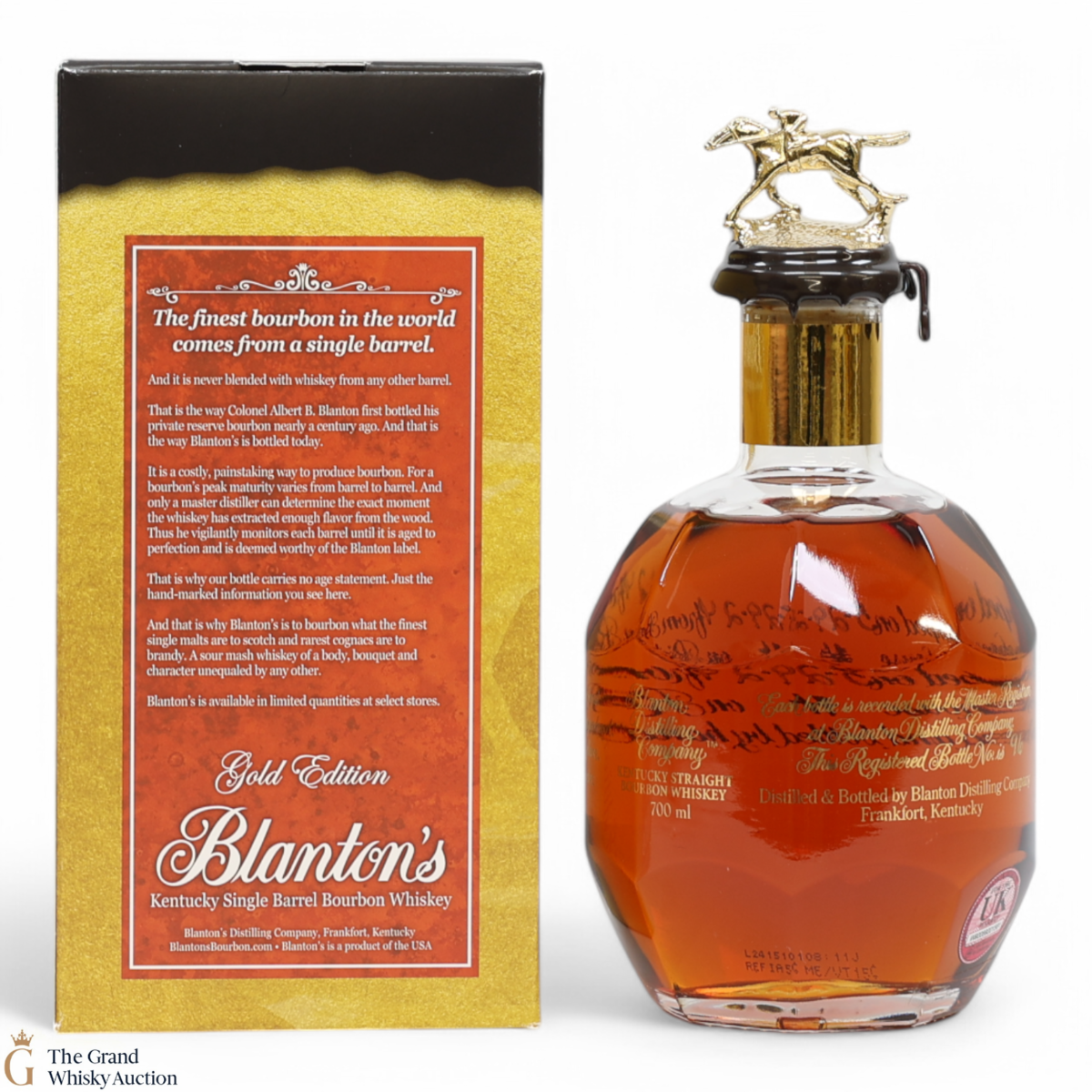 PLEASE NOTE: The wax seal on Blanton's bottles are prone to cracking in transit due to their design. Therefore, as stated in our T&C’s, we do not and will not accept liability should the seal be breached, broken, split or leak in transit. Additionally, please know due to the design of the internal cardboard packaging that surrounds the top of the bottles, it too may be torn. By bidding on this lot you have understood this to be true. Insurance is for complete breakage or loss in transit only.