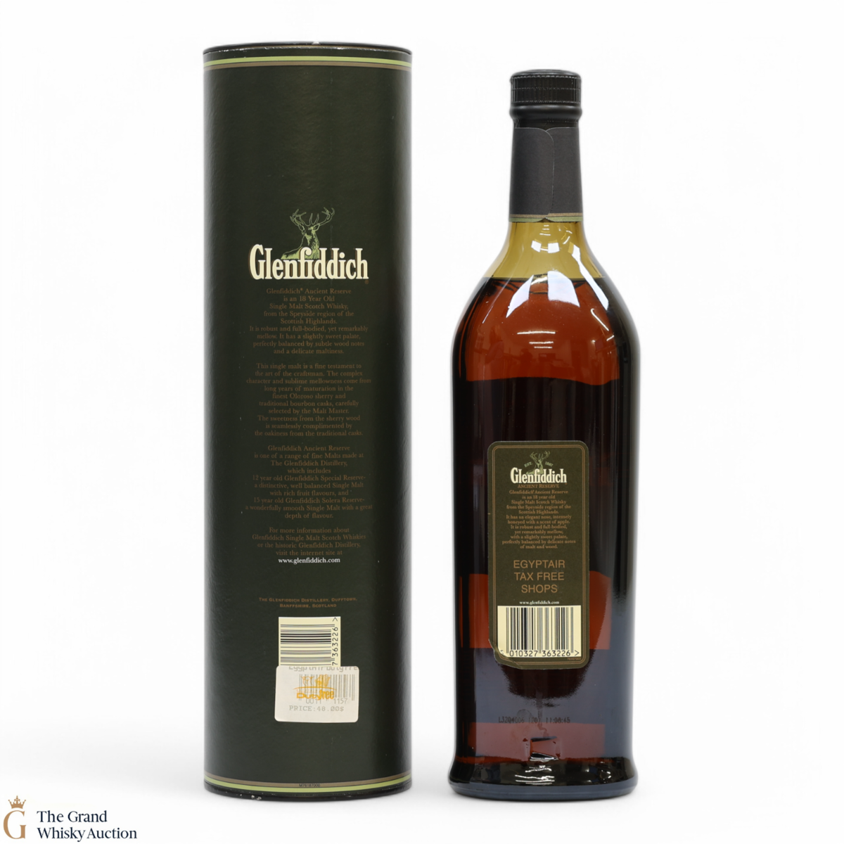 Glenfiddich's 18-year-old Ancient Reserve single malt whisky. This edition comes in the Glenfiddich livery rather than the decanters used in the early 1990s.