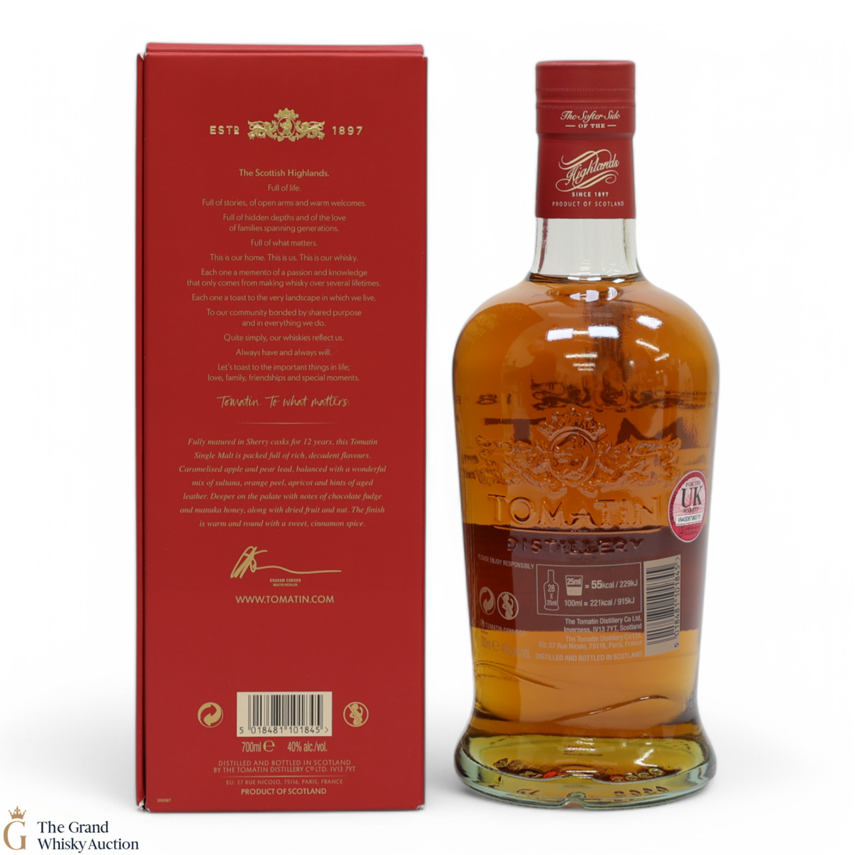 An addition to its core range in 2024, Tomatin's 12-year-old Sherry Cask builds upon the classic 12-year-old but is instead fully matured in sherry casks for 12 years. The bottle design boasts lots of scarlet and gold to pay homage to the flavours imparted by the sherry wood during the cask maturation process.