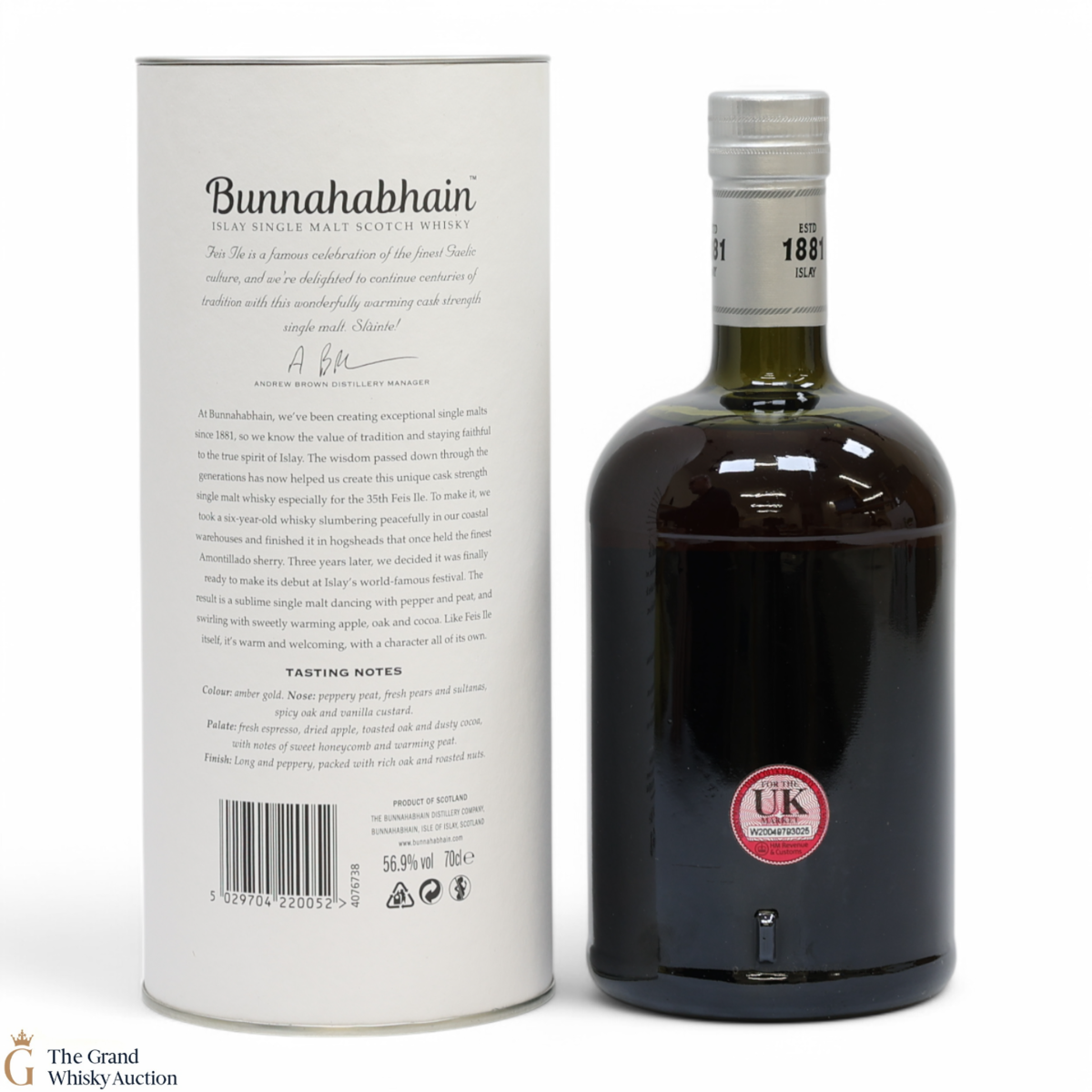 This limited edition single malt from Bunnahabhain Distillery was matured for 6 years in classic bourbon barrels, after which the single malt was transferred to Amontillado sherry Hogsheads for another three years. It was bottled at 56.9% and was released by Bunnahabhain for Fèis Ìle 2020. This is one of only 1658 bottles produced.
