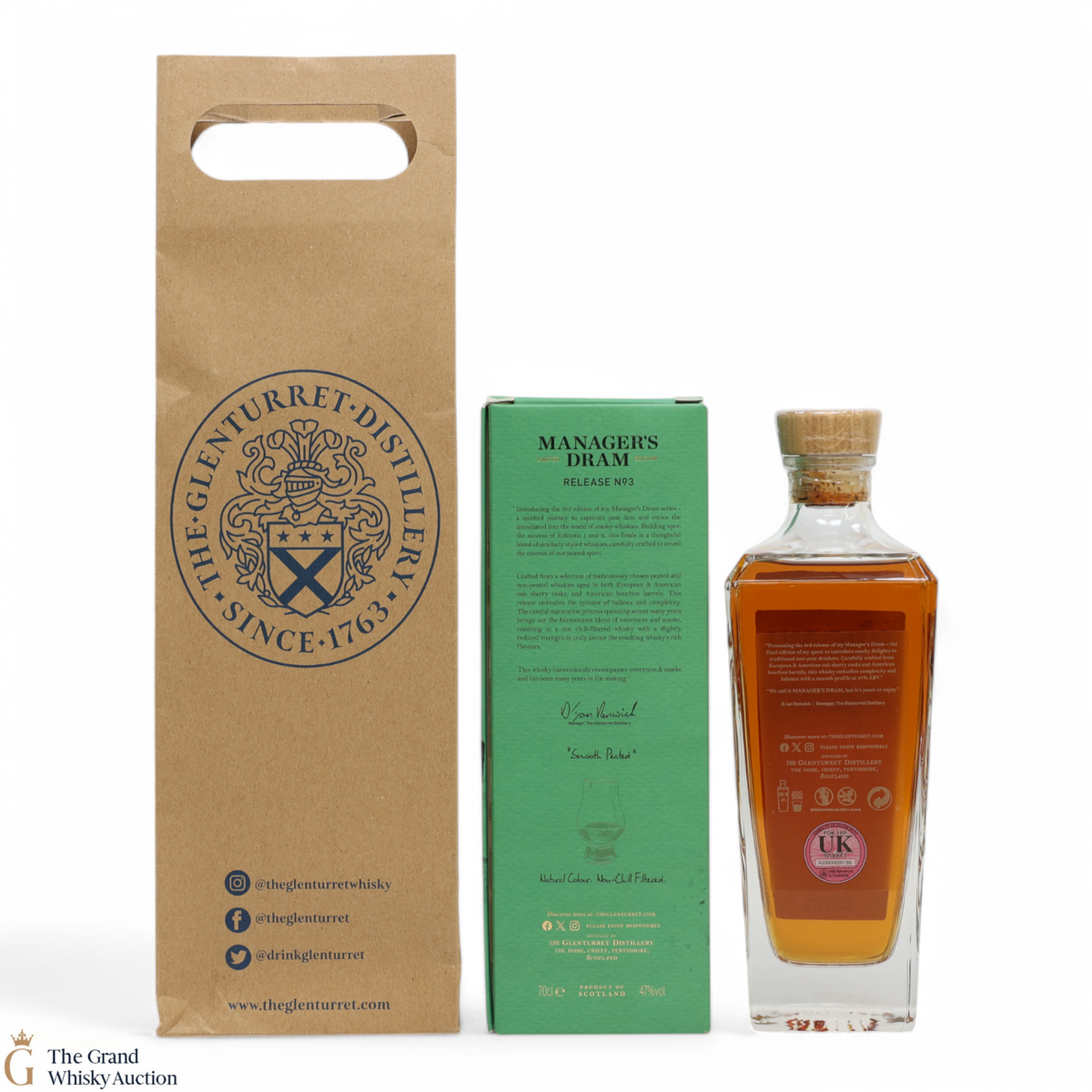 The Glenturret Manager's Dram - Release 3 is described as smooth peated and matured in Ex-Bourbon & Sherry casks before being bottled in 2023.
