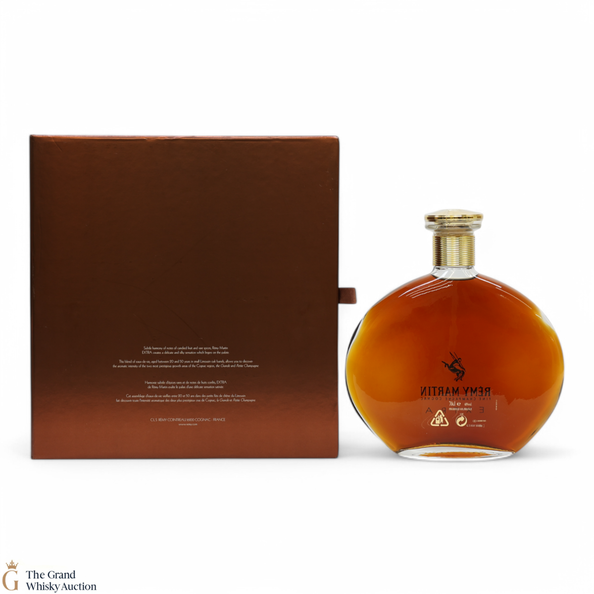 Remy Martin Extra, fine champagne cognac. This elegant decanter has been created to attract the senses of touch and smell, similar to that of a perfume bottle. 90% Grande Champagne and 10% Petite Champagne, aged between 20 and 50 years before blending and bottling.