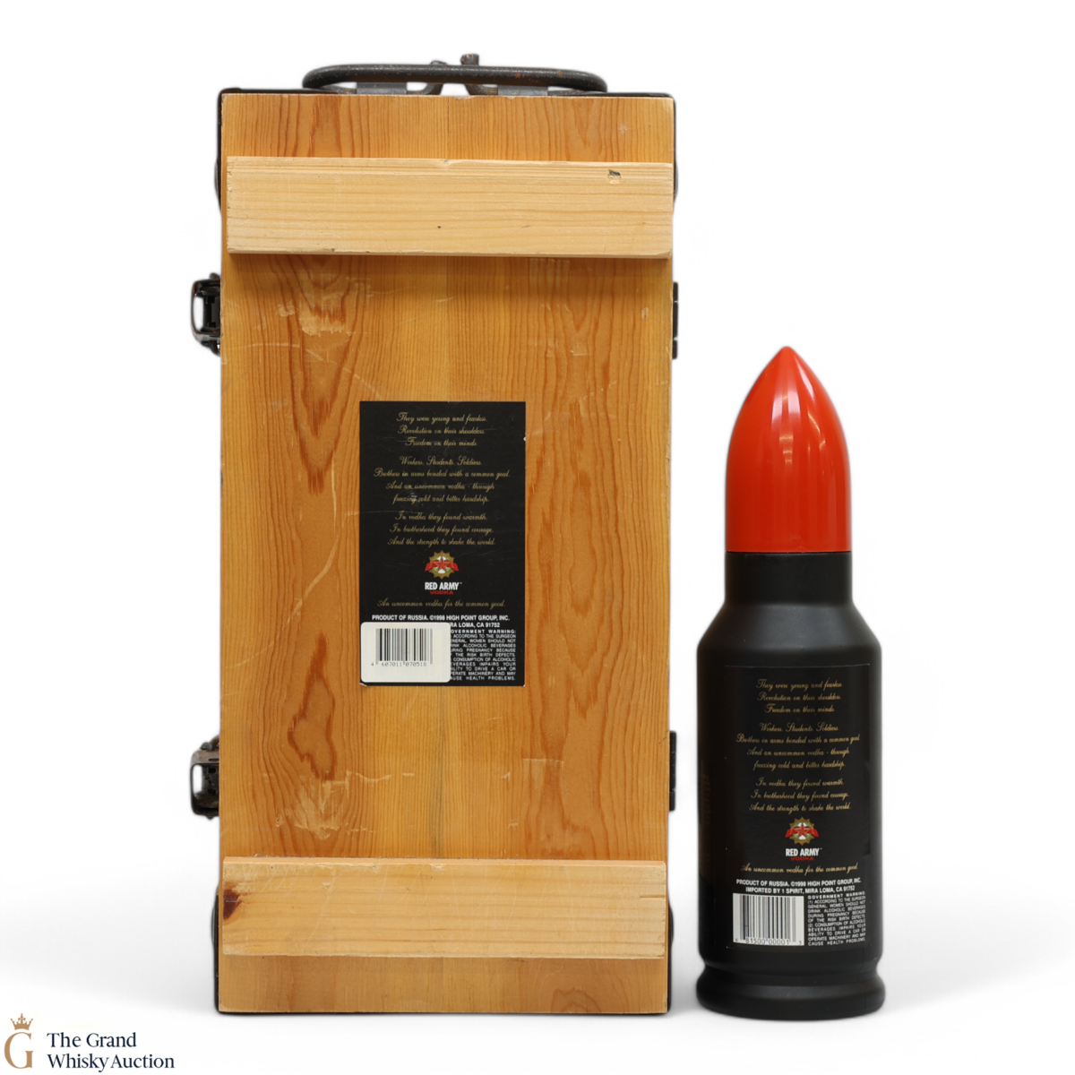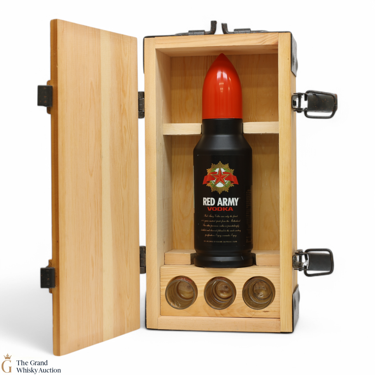 Red Army Vodka in a unique bottle and case containing three shot glasses.
