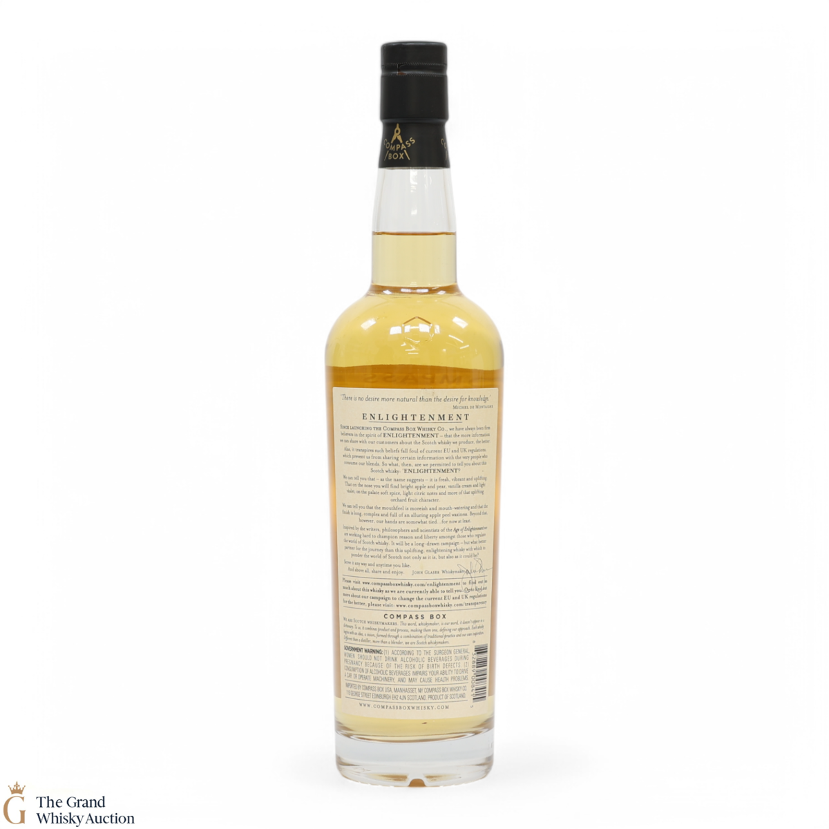 Enlightenment is a 2016 blended malt from Compass Box. A combination of whiskies aged in American-oak barrels from Clynelish, Glentauchers, Balblair and Mortlach.