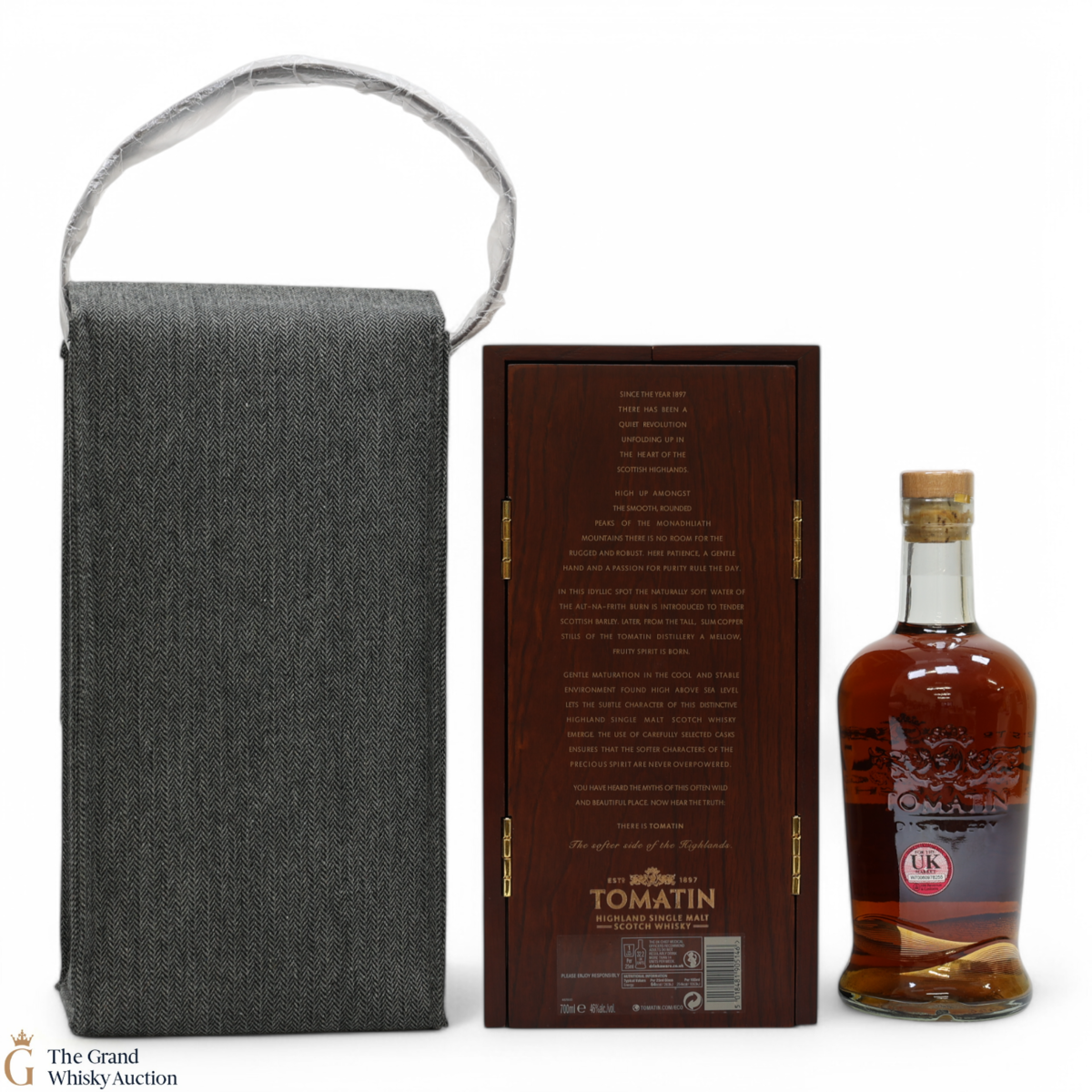 Presented in a tweed casing, inside is a certificate that verifies the authenticity of the accompanying limited edition Tomatin Highland Single Malt Scotch Whisky. The Master Distiller Graham Eunson's signature on this document attests that he has personally selected the casks that have been used to craft this single malt Scotch Whisky.