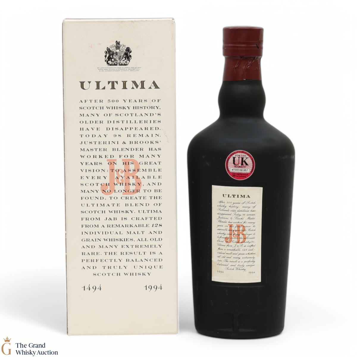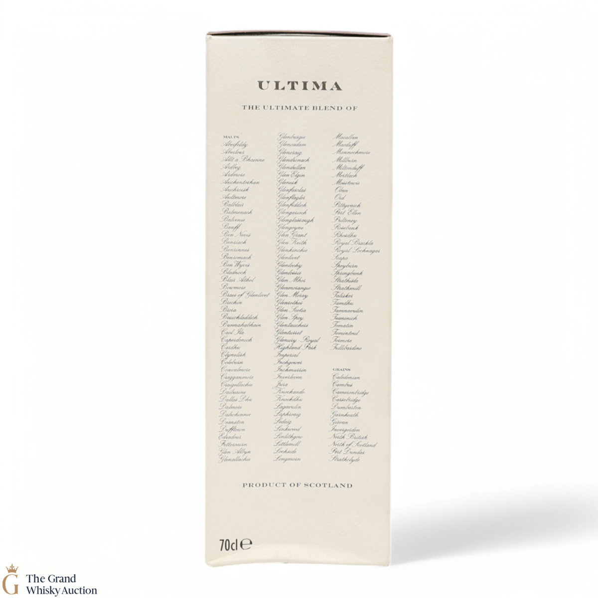 This is malt is now sadly discontinued blend by Justerini & Brooks. Ultima contains whisky from a total of 128 malt and grain distilleries, each of which is listed on the side of the presentation box.