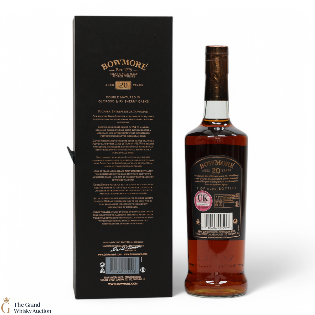 This 20-year-old celebrates and is a testament to the founder of Bowmore. This dram has gone through a double maturation period of 15 years in Oloroso Sherry Butts followed by 5 years in a first fill PX Butts. One of only 6000 bottles.