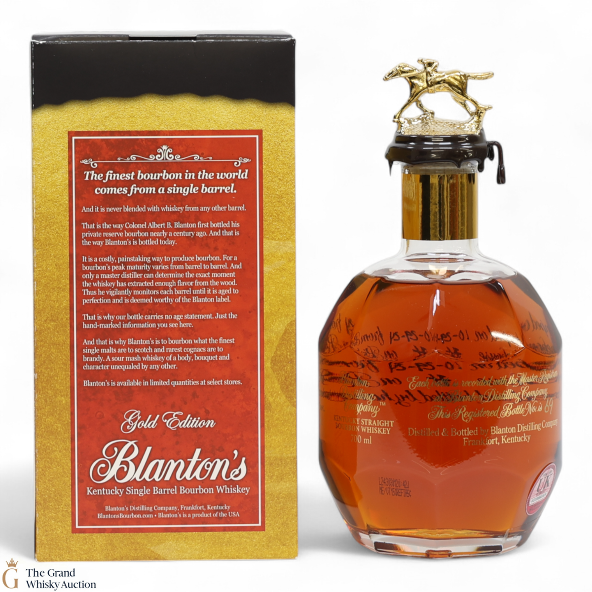 PLEASE NOTE: The wax seal on Blanton's bottles are prone to cracking in transit due to their design. Therefore, as stated in our T&C’s, we do not and will not accept liability should the seal be breached, broken, split or leak in transit. Additionally, please know due to the design of the internal cardboard packaging that surrounds the top of the bottles, it too may be torn. By bidding on this lot you have understood this to be true. Insurance is for complete breakage or loss in transit only.