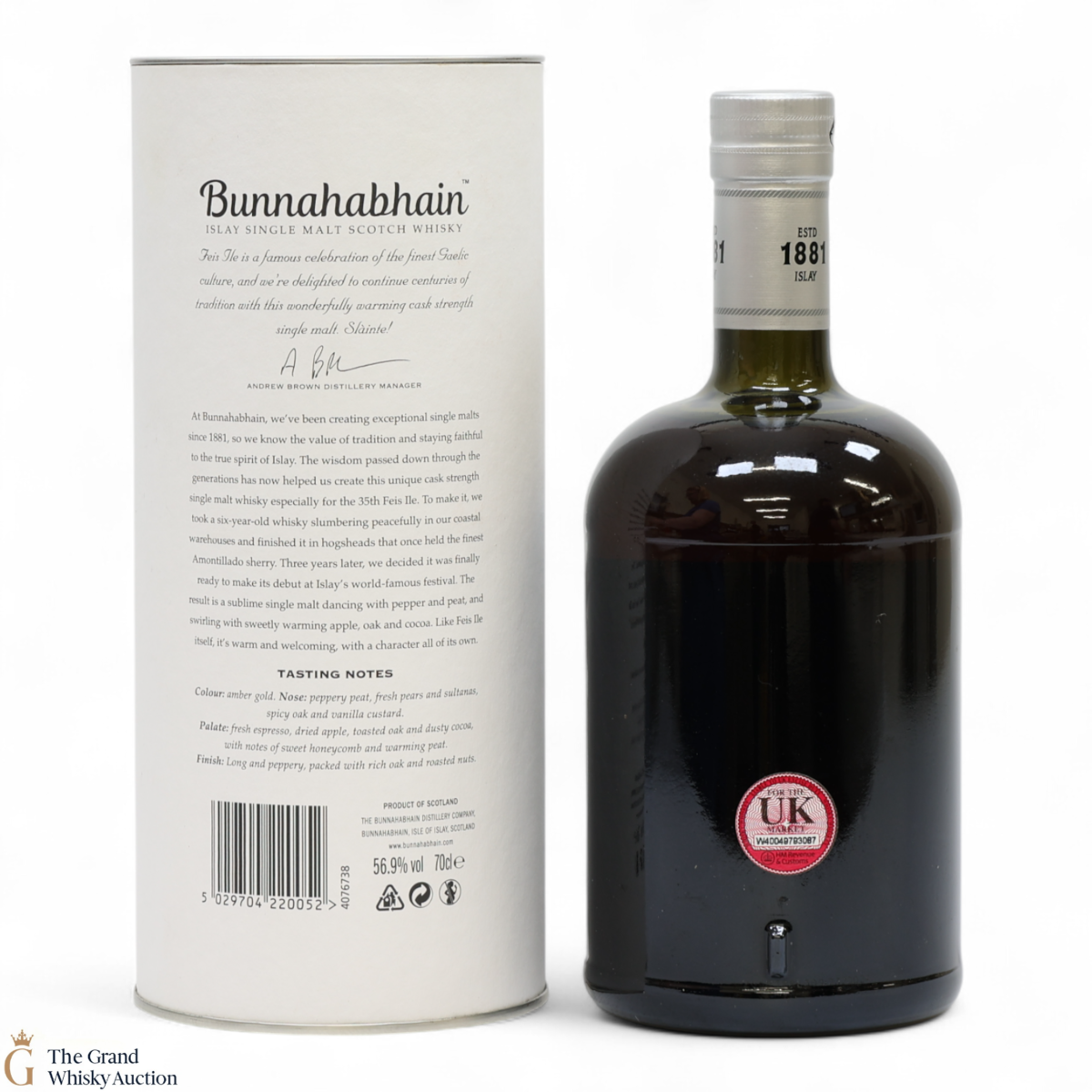 This limited edition single malt from Bunnahabhain Distillery was matured for 6 years in classic bourbon barrels, after which the single malt was transferred to Amontillado sherry Hogsheads for another three years. It was bottled at 56.9% and was released by Bunnahabhain for Fèis Ìle 2020. This is one of only 1658 bottles produced.