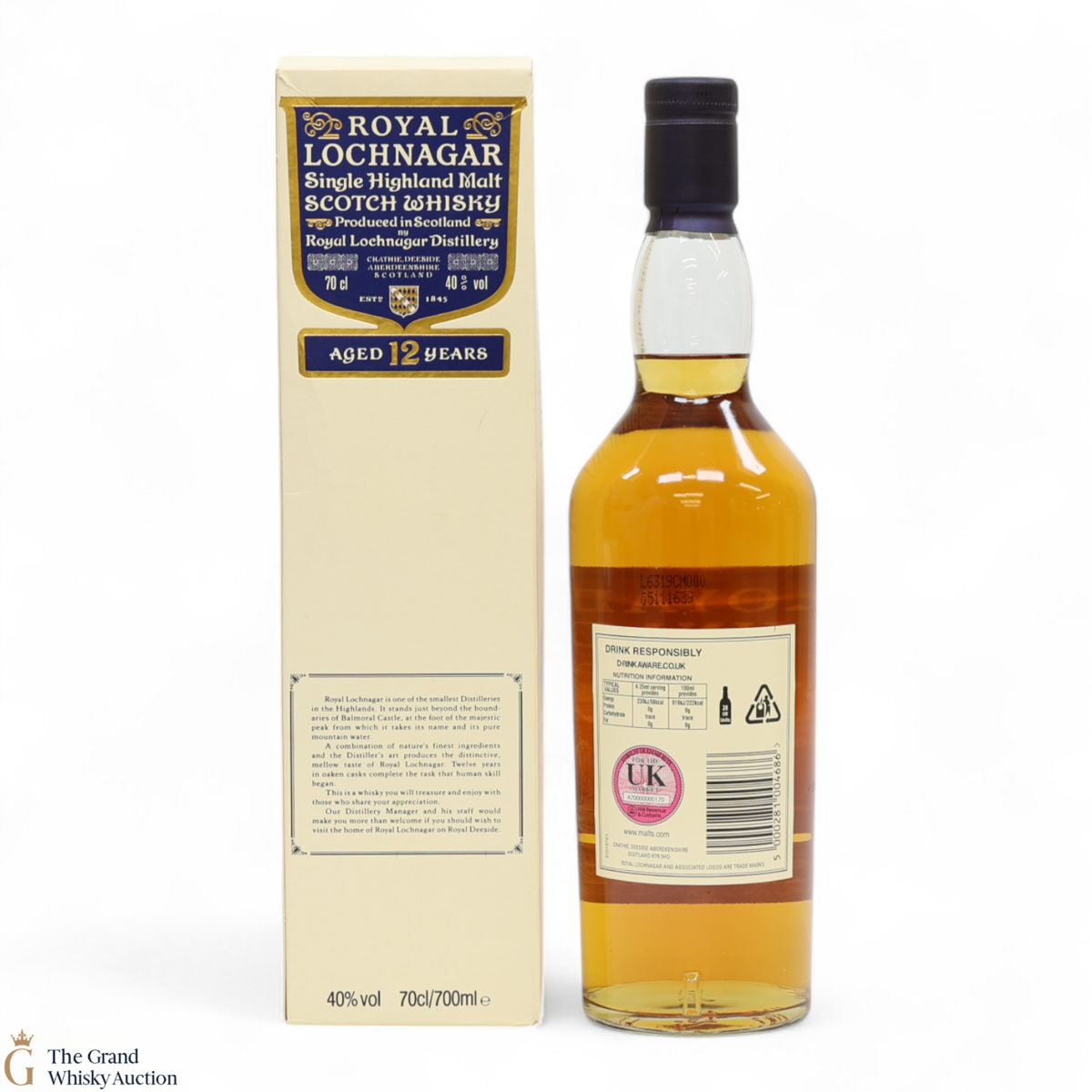 Due to the various ages of bottles and their seals, the condition of liquid is at the buyer's discretion and no claim can be lodged against failure/leakage in transit. Loss and breakage cover is available at 3% of the hammer price as standard. If the lot is not insured, no claim can be lodged against the courier or The Grand Whisky Auction for breakage or loss in transit.