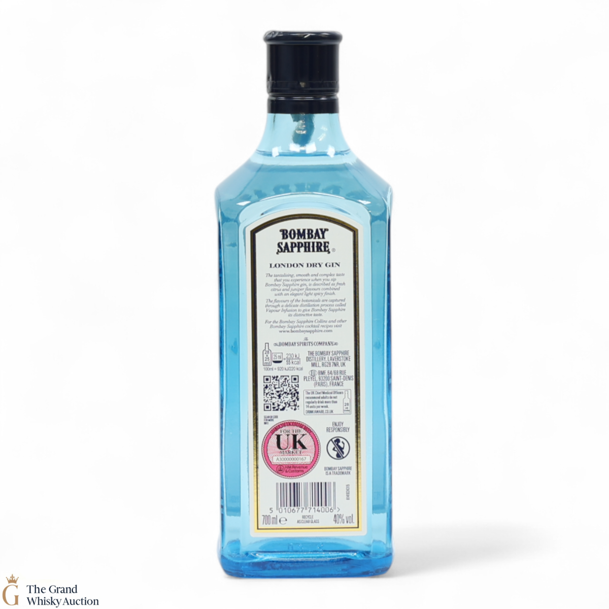 Bombay Sapphire London Dry Gin in its distinctive blue bottle. Every drop contains 10 hand-selected botanicals from exotic locations around the world.