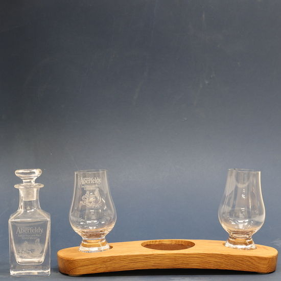 This lot has one branded Aberfeldy whisky decanter, one branded glass, and one unbranded glass.