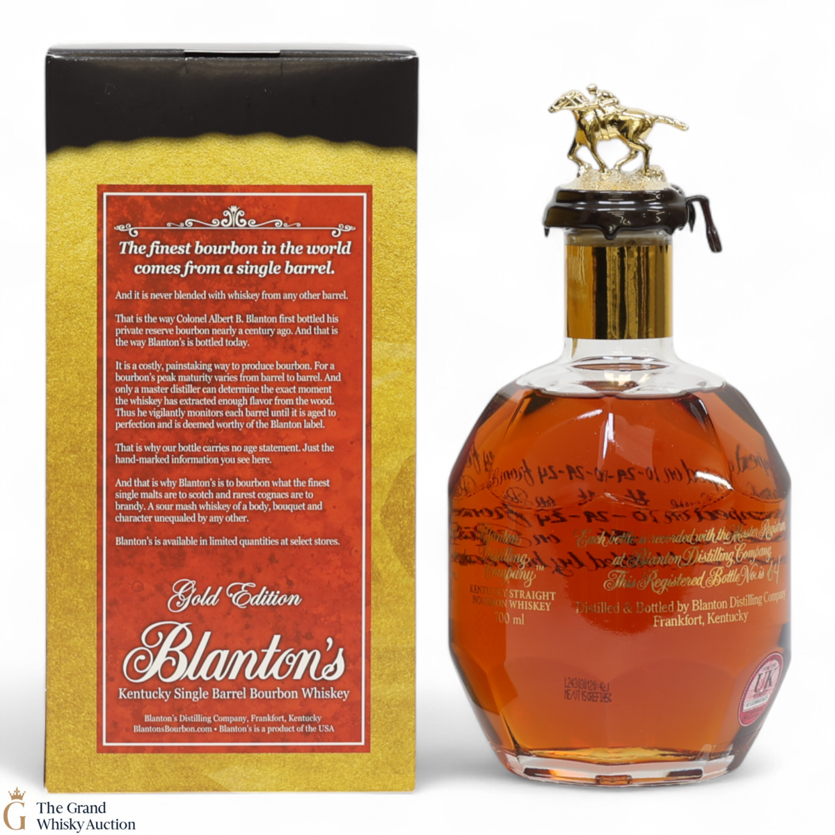 PLEASE NOTE: The wax seal on Blanton's bottles are prone to cracking in transit due to their design. Therefore, as stated in our T&C’s, we do not and will not accept liability should the seal be breached, broken, split or leak in transit. Additionally, please know due to the design of the internal cardboard packaging that surrounds the top of the bottles, it too may be torn. By bidding on this lot you have understood this to be true. Insurance is for complete breakage or loss in transit only.